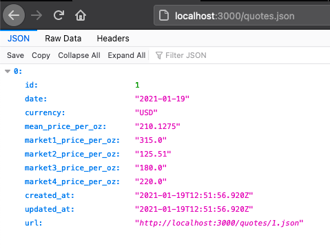 At this point, we have basic CRUD for quotes. If we append `.json` to the url, we get a nice JSON output that we will use for the API in the next installment.