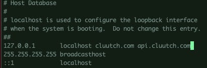 Instead, we can update `/etc/hosts`. With a small modification, the computer will redirect all requests to `cluutch.com` or `api.cluutch.com` to localhost. Note, that I am using `cluutch.com`, not `cluutch.io`. I do not want to spoof the address of the real website, otherwise I would not be available to access the real website from my computer once its online because my computer would try to redirect me to localhost.