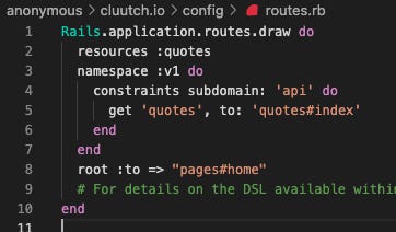 Then update routes.rb. This will expose quotes under the v1 namespace, but only for the subdomain api.