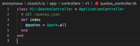 Because we already defined `resources: :quotes` in `routes.rb`, our rails app is serving both the HTML and JSON responses at `/quotes and /quotes.json` respectively. To move the JSON response to the v1/quotes endpoint, we first create a controller for it: