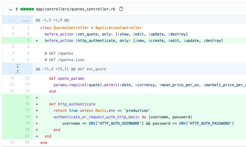 Basic HTTP Authentication is ugly but it works. In the last commit of the series, I add HTTP auth to protect the new, edit, and delete endpoints. Most of the code is in the quotes controller, by adding a filter.