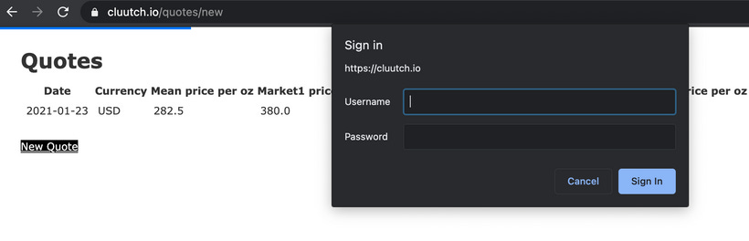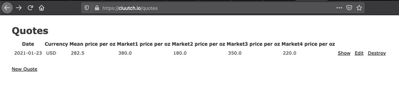[{"id":1,"date":"2021-01-19","currency":"USD","mean_price_per_oz":"210.1275","market1_price_per_oz":"315.0","market2_price_per_oz":"125.51","market3_price_per_oz":"180.0","market4_price_per_oz":"220.0","created_at":"2021-01-19T12:51:56.920Z","updated_at":"2021-01-19T12:51:56.920Z","url":"http://api.cluutch.com:3000/quotes/1.json"}]