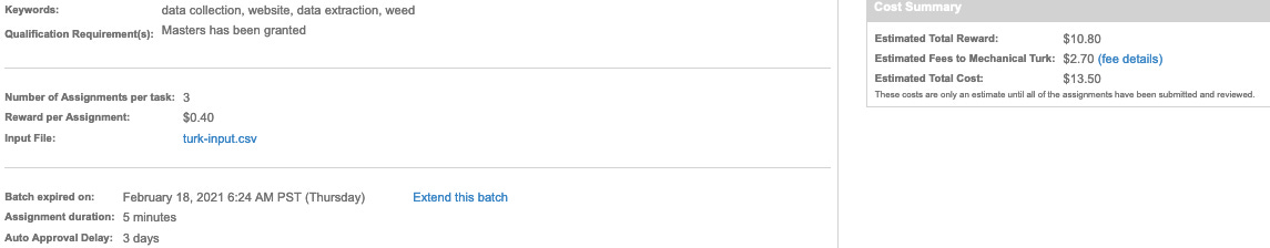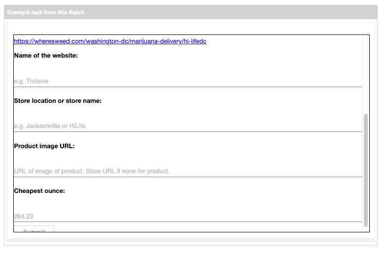 But even though the form is straightforward, the task is not. Taking into account your average person’s lack of knowledge about weed and the inconsistent layout of the websites, it is important to be very explicit about the rules. These are the instructions from the mTurk listing.