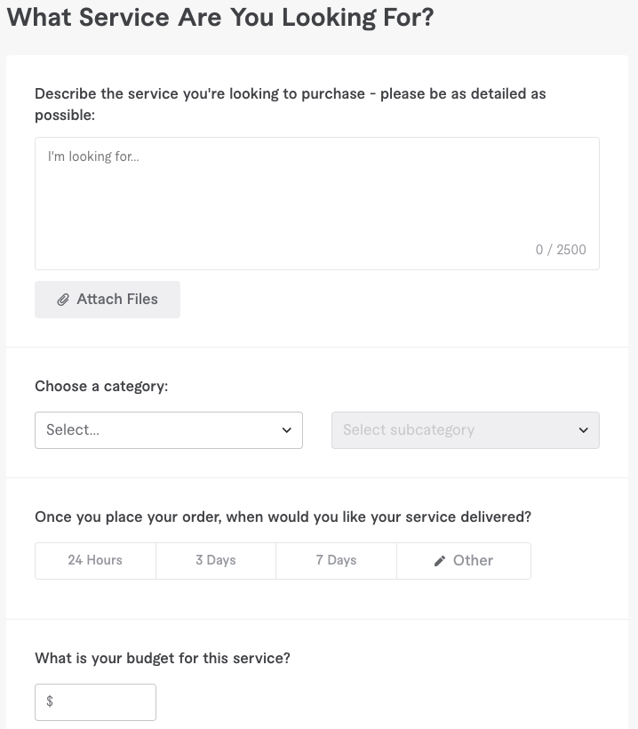 Fiverr was the first app I tried out. Jobs on Fiverr are called Requests and the form to create them is very basic.
