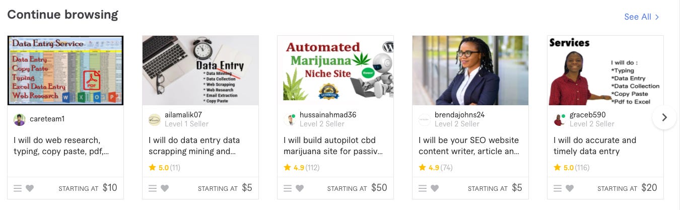 On Fiverr you can also browse Services. I found it hard to evaluate who would be a good fit. At that time, the cluutch process for determining weed prices was to compare “similar hybrid strains”. Now I just take the cheapest from each website. That said, a lack of familiarity with weed was problematic.